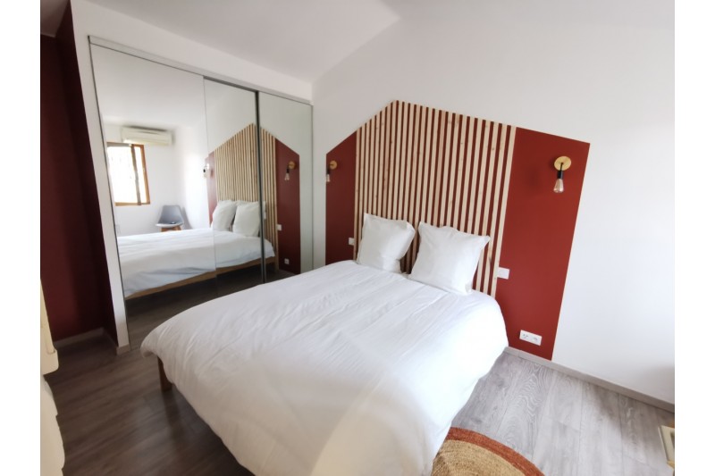 Au rez-de-chaussée, vous trouverez un spacieux salon / salle à manger climatisé, une cuisine indépendante entièrement équipée avec une grande verrière ouvrant sur une cour intérieure privative avec piscine, une salle d'eau, un WC indépendant ainsi qu'un garage.